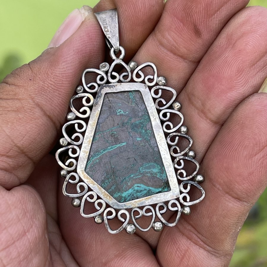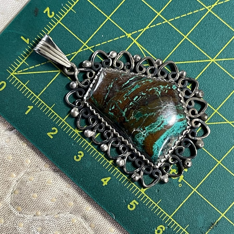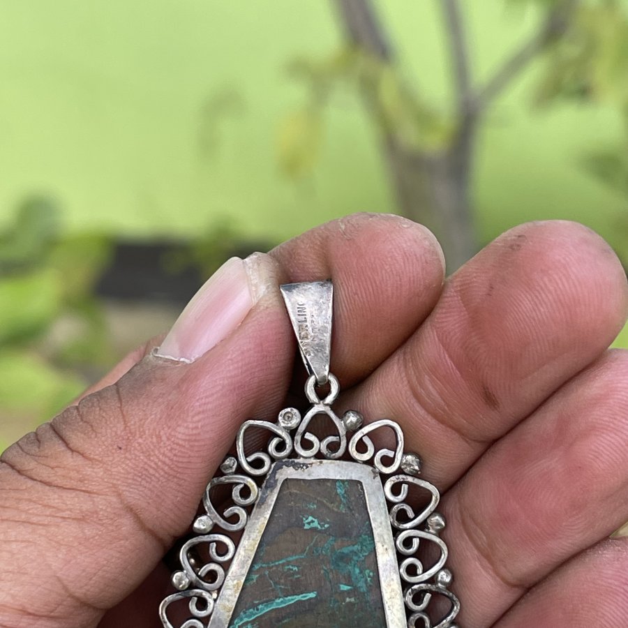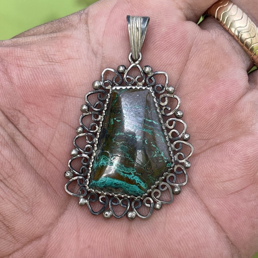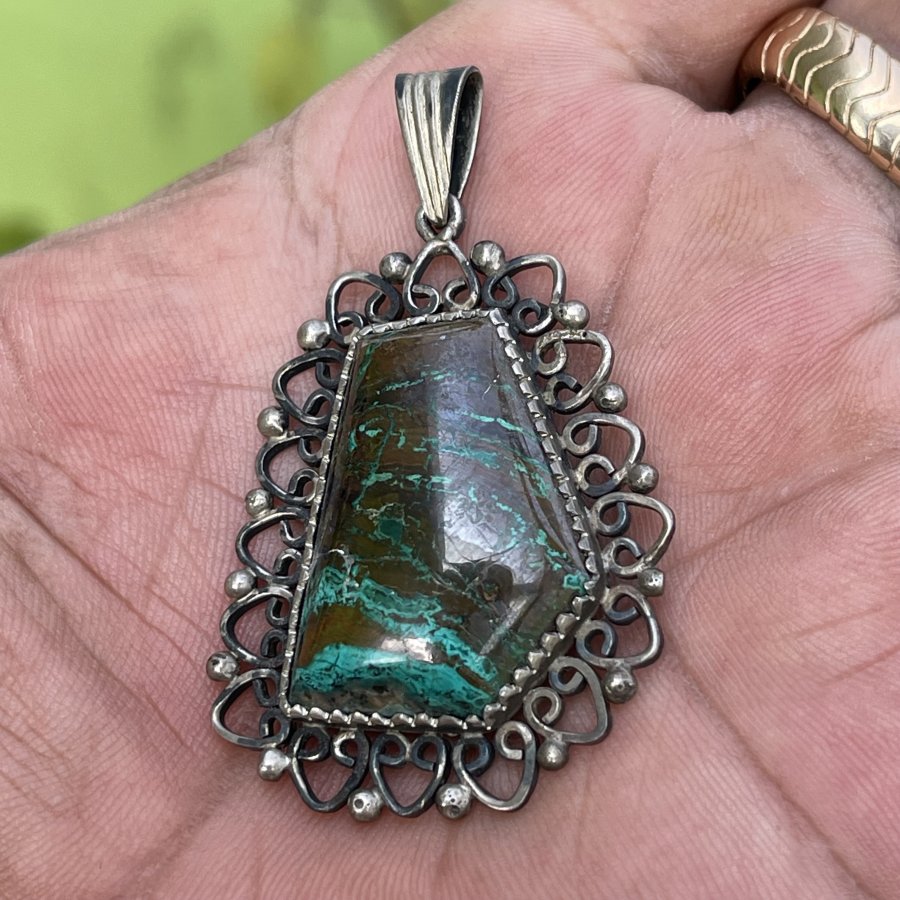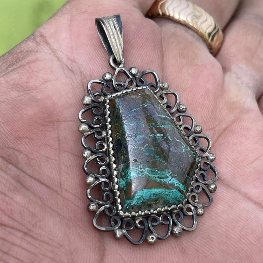 Mặt dây chuyền xưa ngoại chế tác thủ công đính đá Chrysacolla đa sắc thiên nhiên - chất liệu bạc nguyên khối - trọng lượng 12gram3 - kham khảo giá nước ngoài cự đắt gần 7 triệu - em bán 888k ( KMC ). Kính mời