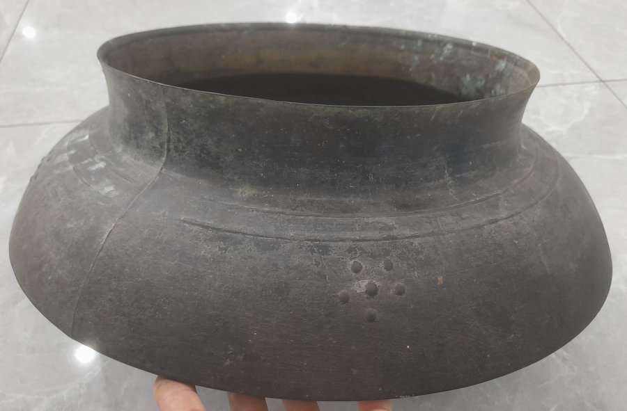 Nồi đồng xưa, đường kính miệng 30cm x đường kính thân max khoảng 44cm x nặng 4,8kg.