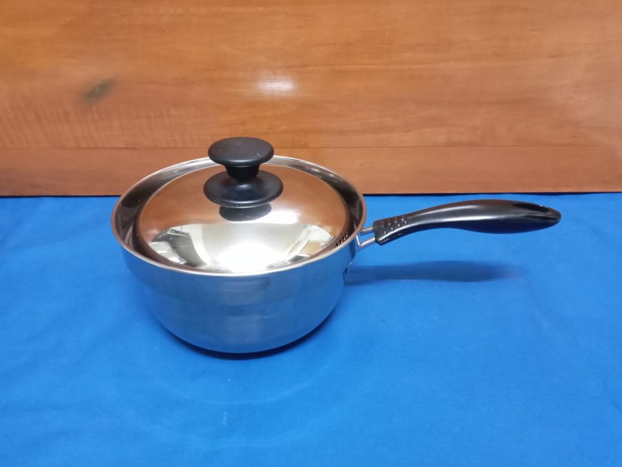 Hàng khui kiện còn mới đẹp chưa dùng, không thấy hiệu, thường là hàng si nhật, dầy nặng 750g, chắc chắn, có mực đo nước, 2 đáy nấu được bếp từ.