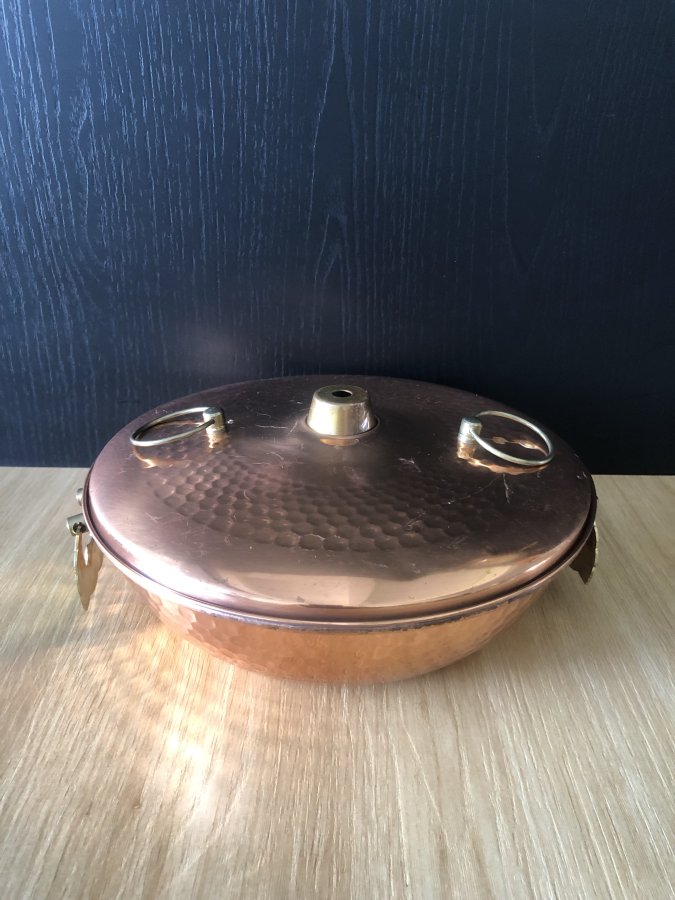 Sản phẩm được gò tay vân búa thủ công,còn lành nguyên sử dụng tốt,lòng trong có trầy xước và đốm đen hiện tượng đồng theo thời gian,sezi ngang 26cm,cao tổng 10cm.Anh chị mua về sử dụng trên bếp gas ok.Cảm ơn đã xem tin