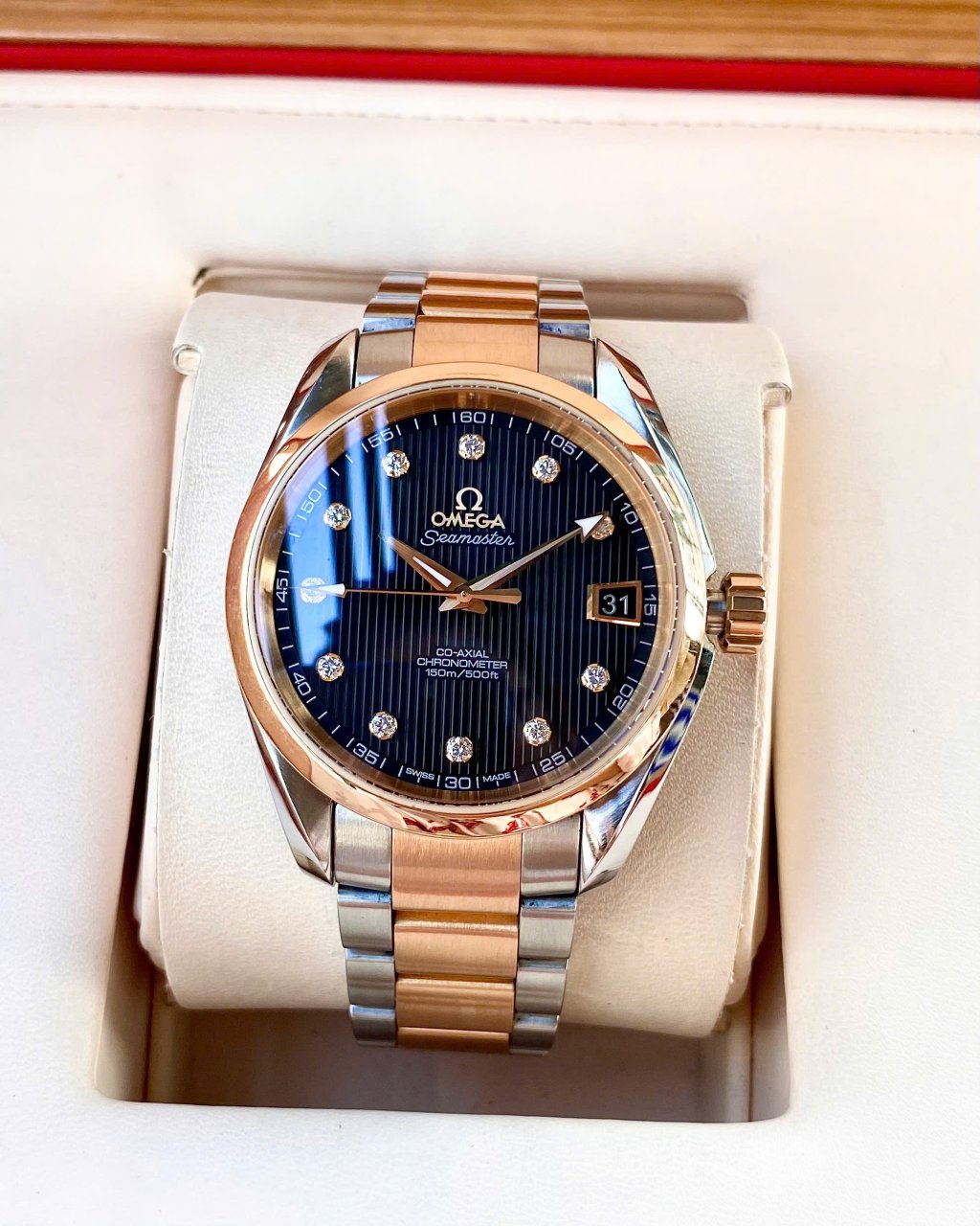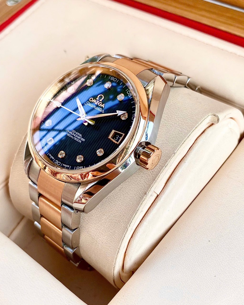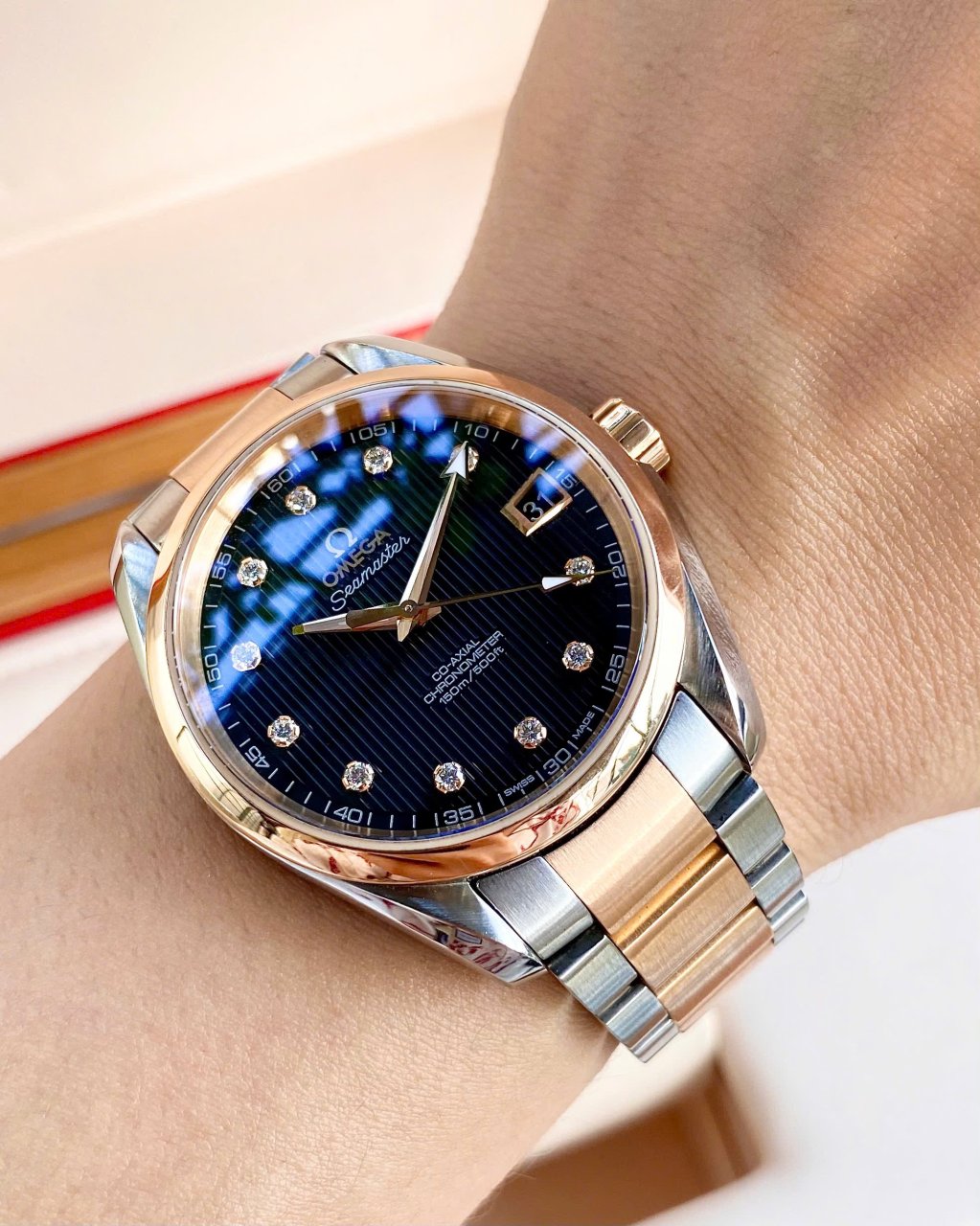 OMEGA Aqua Terra 8500 Big Diamonds, Demi Vàng hồng 18k, Size 38.5mm, Like new fullbox, Giao lưu 138 triệu (Retail: ~ 300 triệu) ah