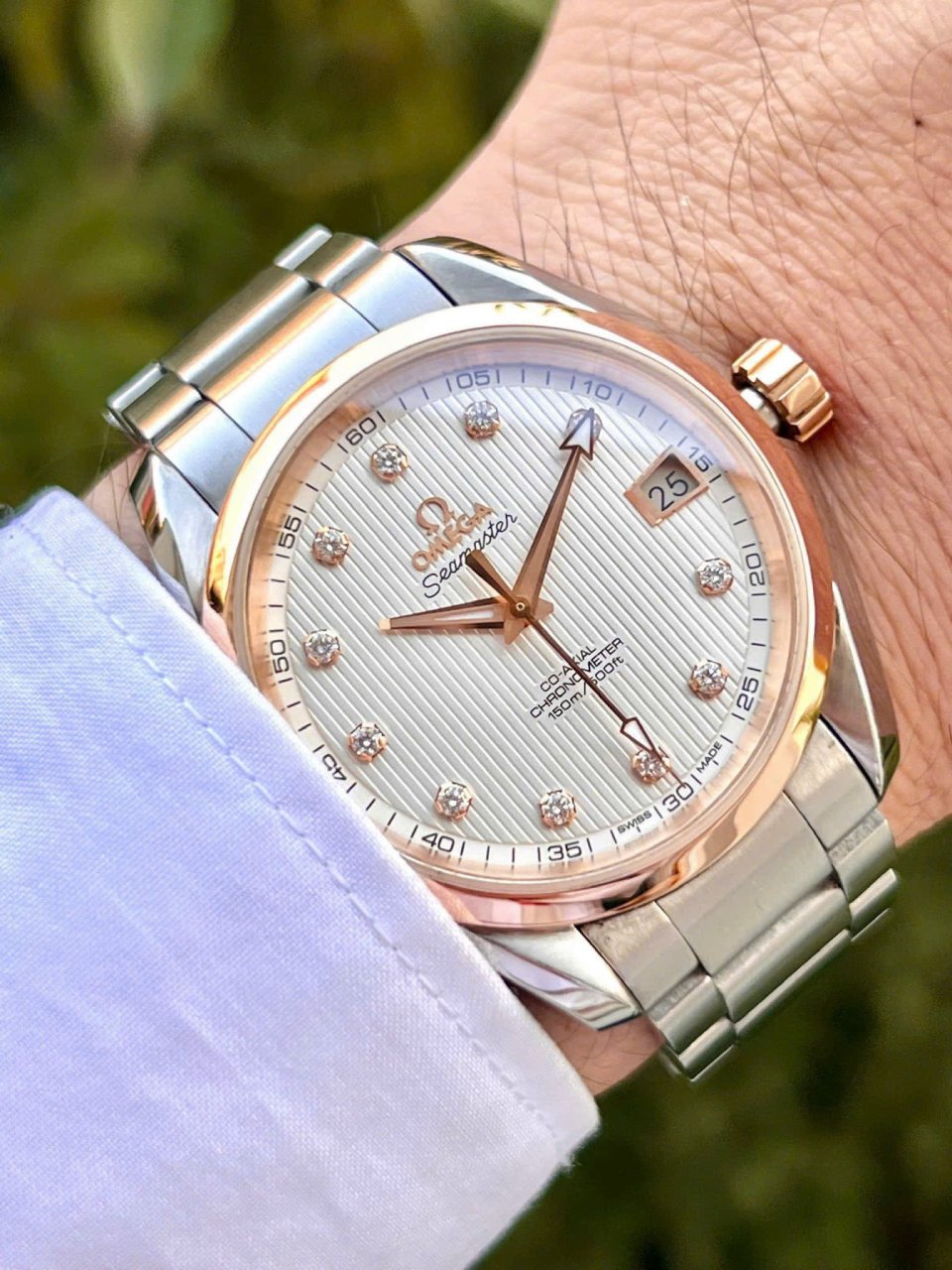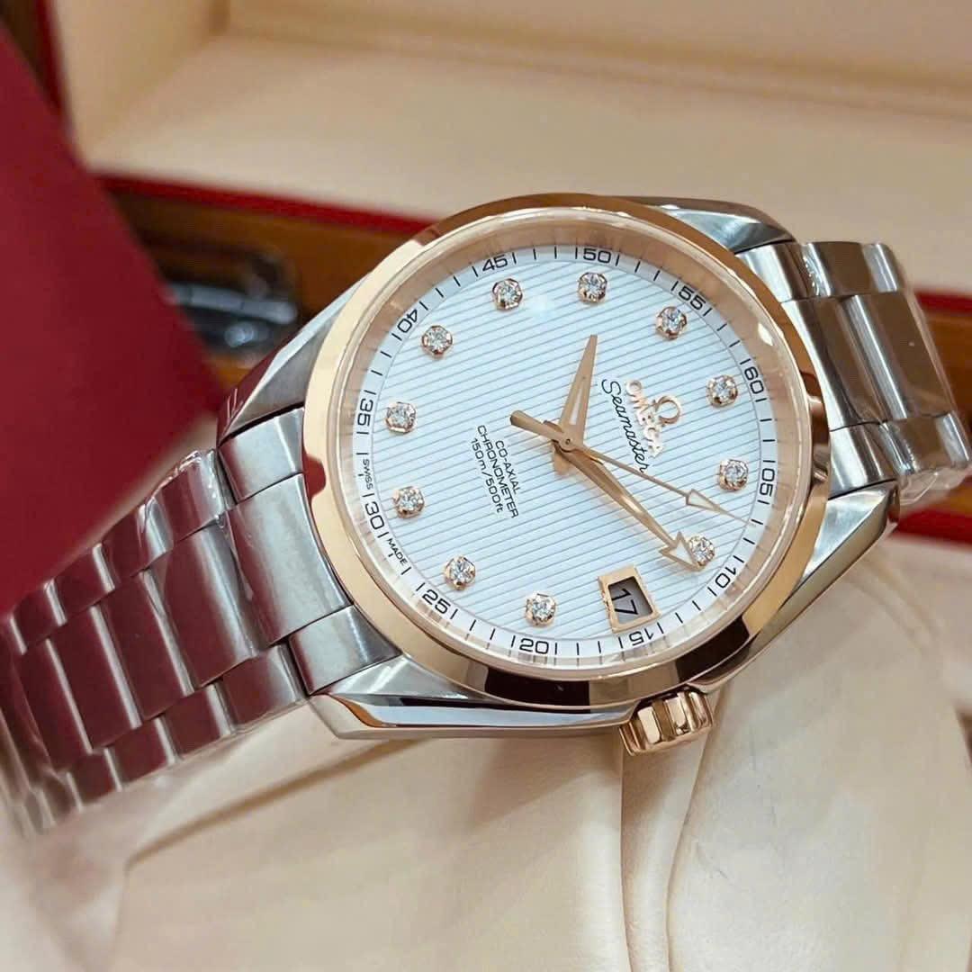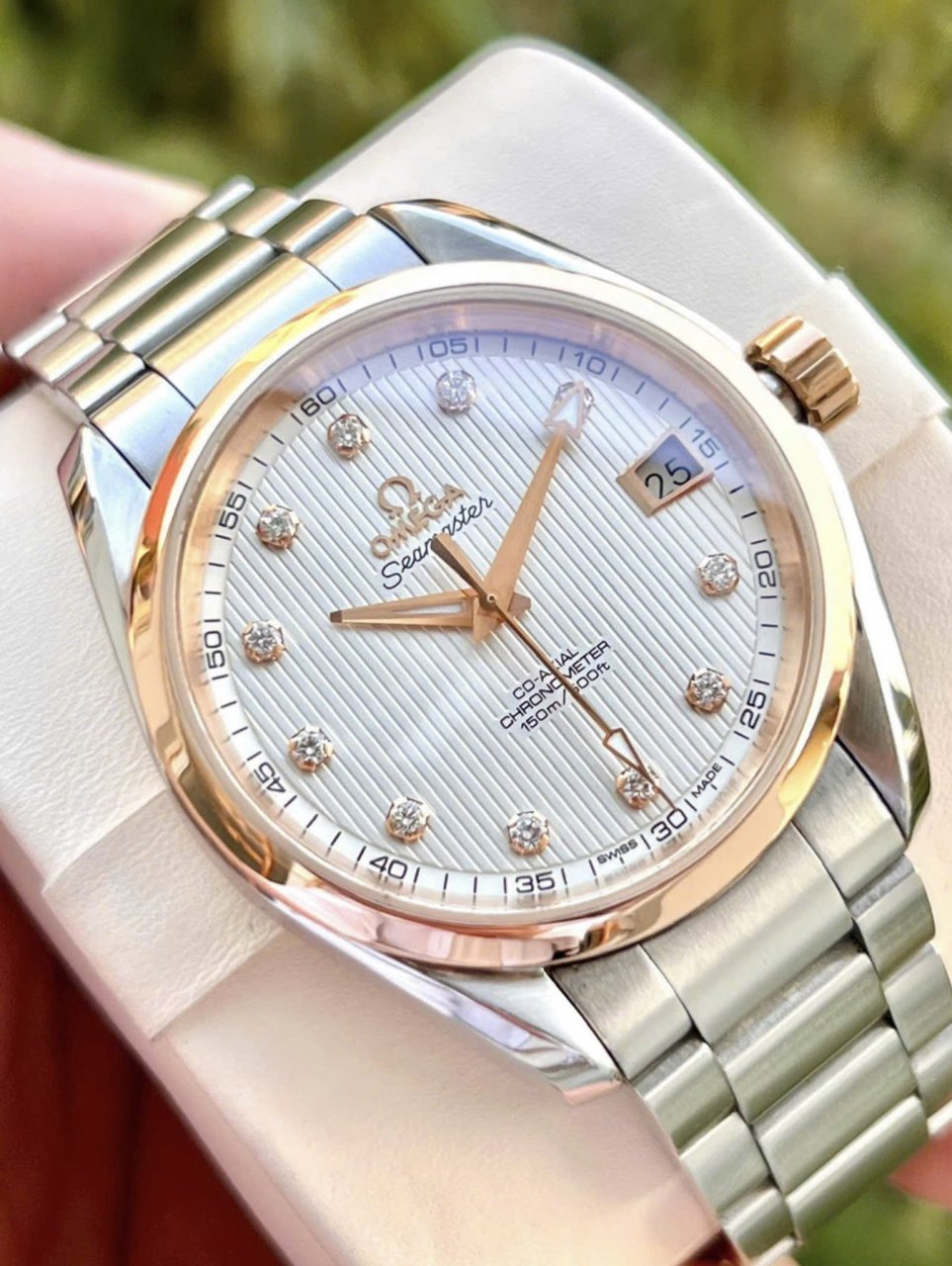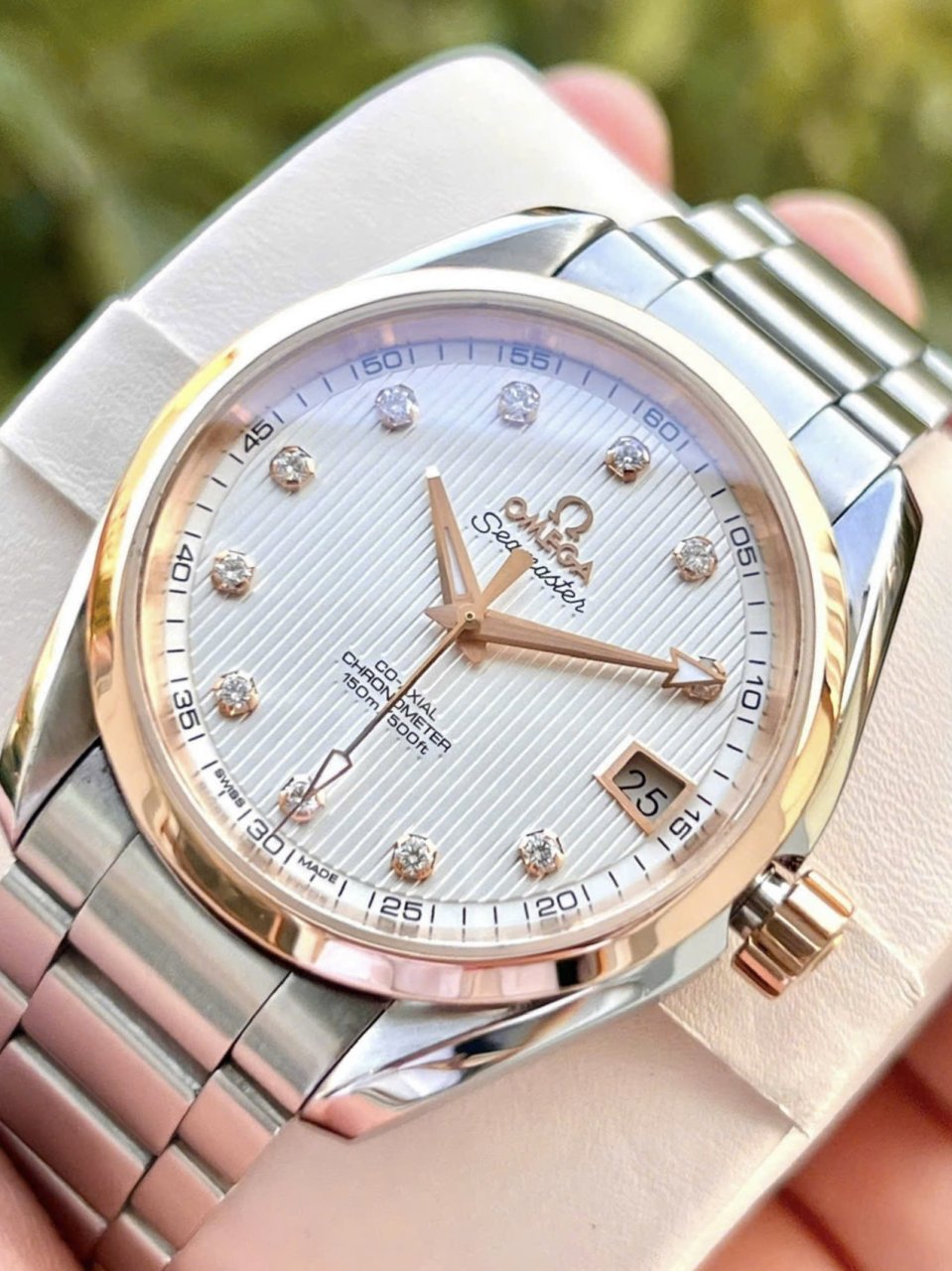 OMEGA Aqua Terra 8500 Big Diamonds, Vàng hồng đúc 18k, Size 38.5mm, Like new fullbox date khá cao (Bảo hành CHTC), Giao lưu quanh 100 triệu (Retail: ~ 285triệu) ah
