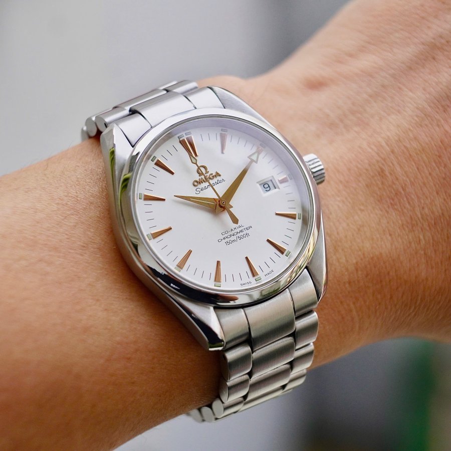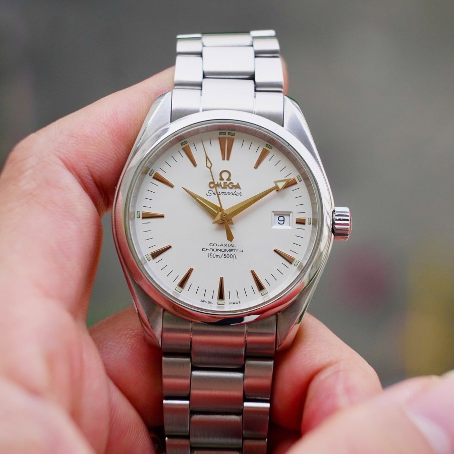 Omega Aqua Terra đời máy 2500 luôn có một chất rất riêng: thiết kế thanh lịch, kim cọc mảnh, dáng vỏ gọn. Bản mặt trắng – kim cọc gold tone lại càng hiếm.