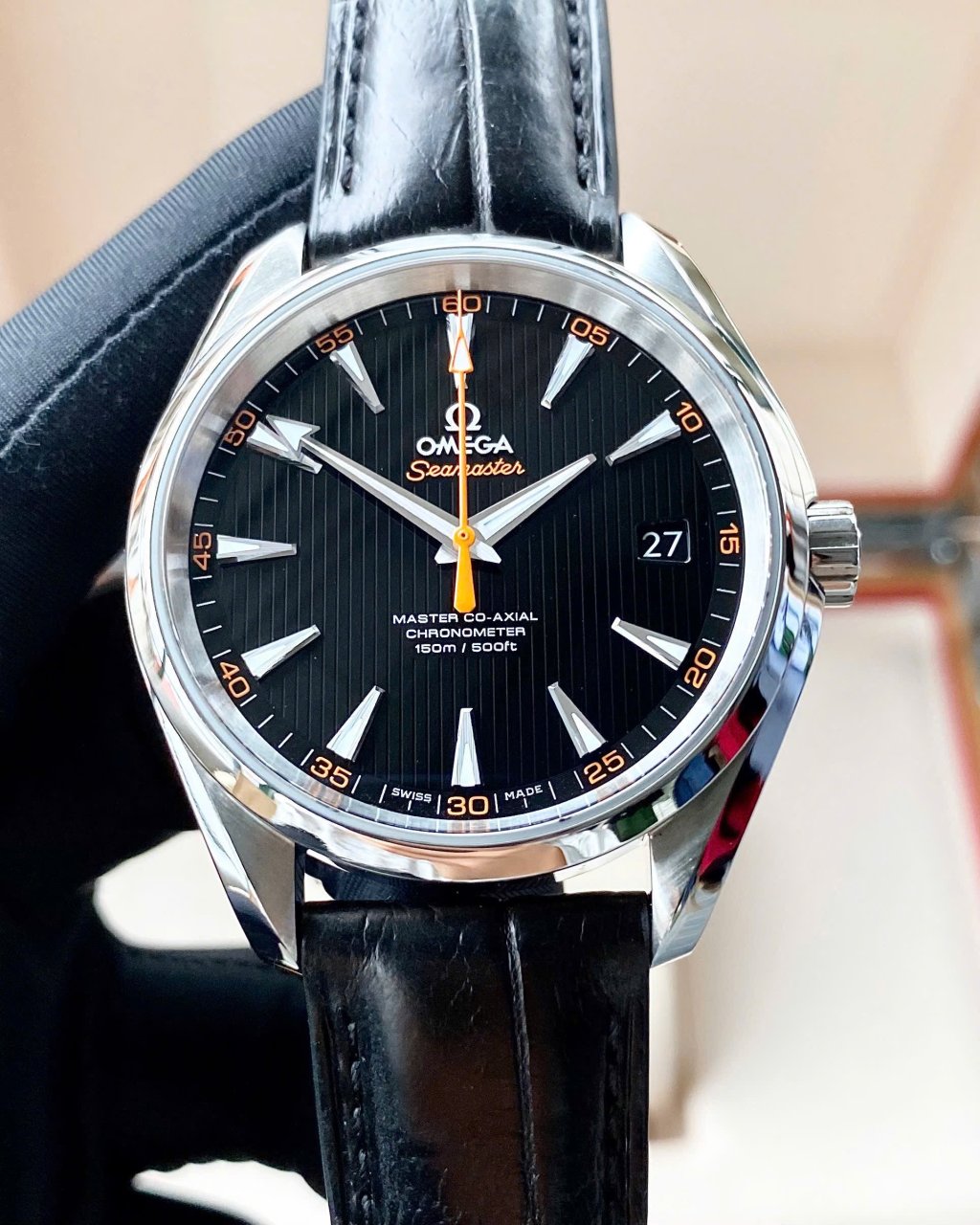 Aqua Terra nhưng mặt Đen, kim cọc điểm Cam dây da màu trẻ
