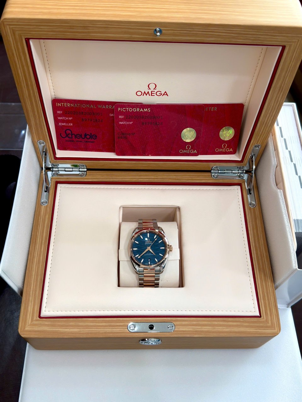 OMEGA Aqua Terrra 8800 Master Chronometer xanh Blue, Ref: 220.20.38.20.03.001, Vàng hồng đúc 18k nguyên khối, Size 38mm, Like new fullbox date cao 2024 (Bảo hành chính hãng toàn cầu đến 2029), Giao lưu 155 triệu (Retail: 425 triệu) ah