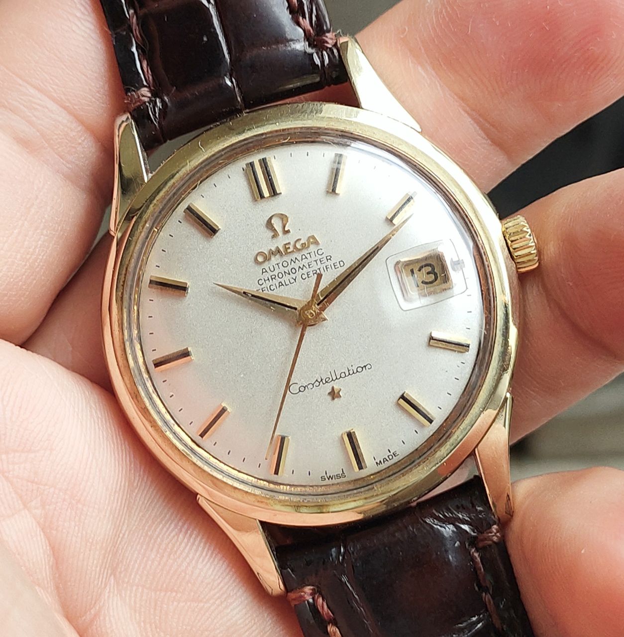 Rumbo sưu tầm, Size khủng nhất của thương hiệu vintag ít gặp Omega Constellation, zin nguyên củ, mặt cát zin, cọc cài đá đen, kính lúp zin có logo, máy Leng keng long lanh và đang hoạt động hoàn hảo. Size men 37 không đo núm