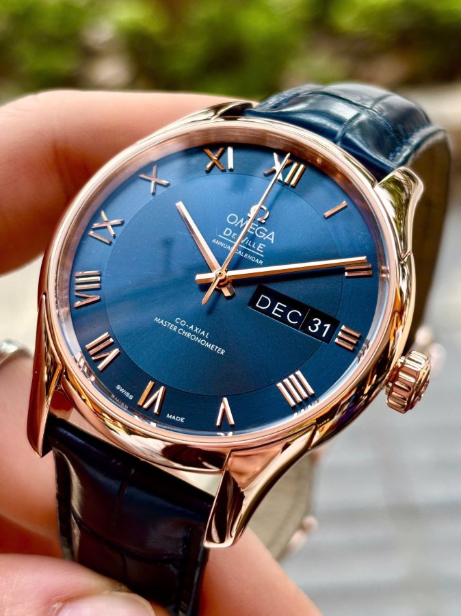 OMEGA De Ville Hour Vision Blue 8903 Annual Calendar Month-Date, Ref: 433.53.41.22.03.001, Vỏ + khoá đôi Vàng hồng đúc 18k nguyên khối, Size 41mm, Like new fullbox date cao (Bảo hành Toàn Cầu), Giao lưu 328 triệu (Retail:~600 triệu) ah