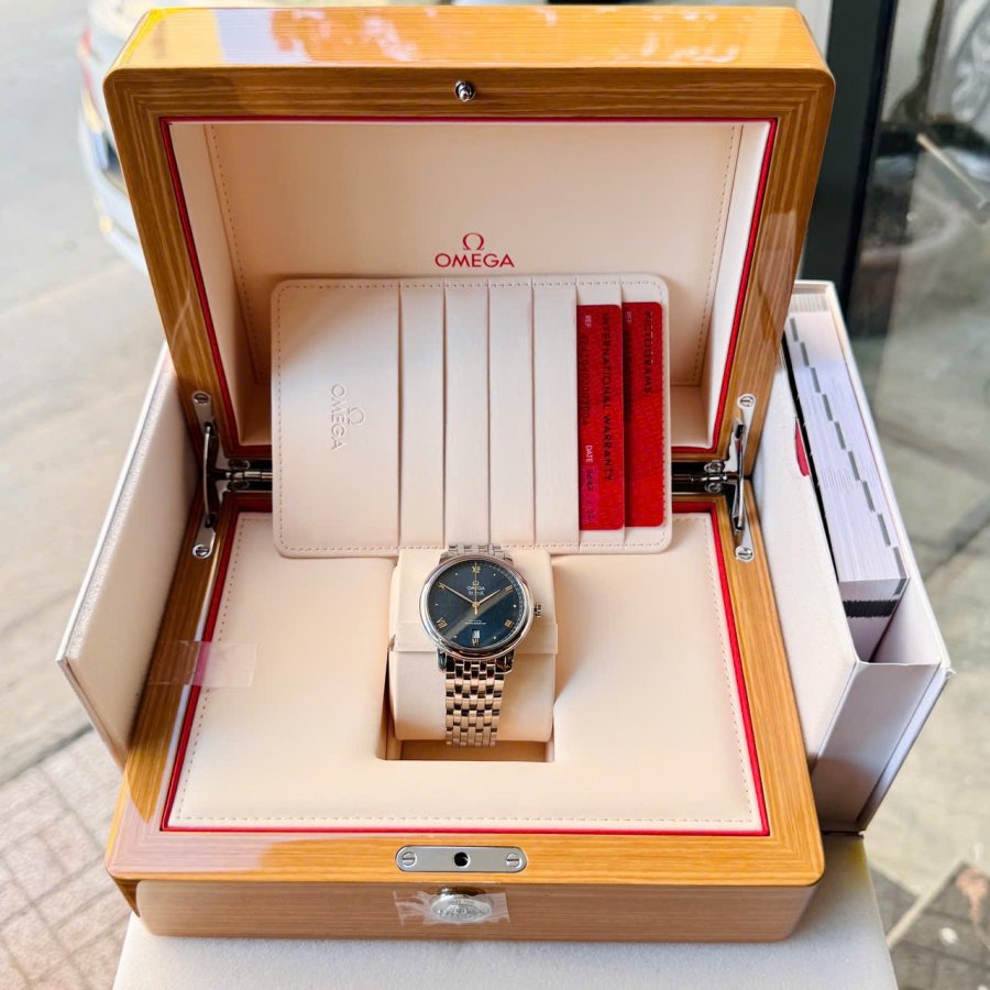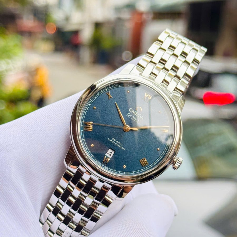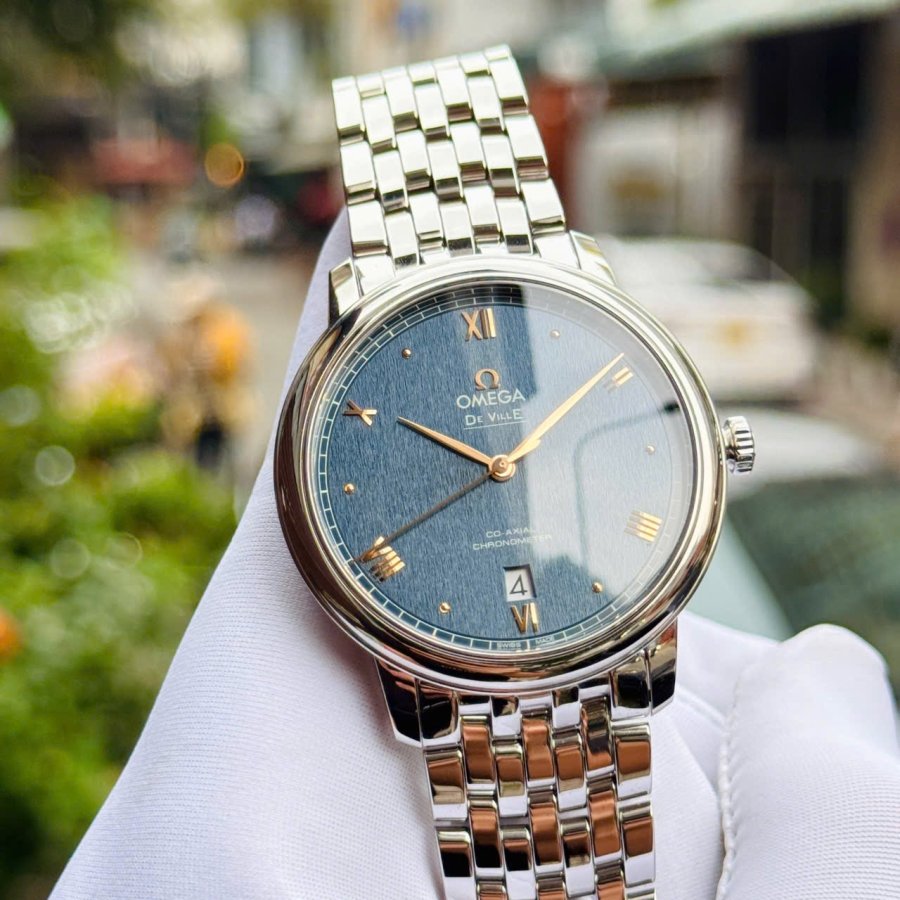 •Model đời mới của dòng Deville Prestige, với dial lụa xanh navy Guilloche tuyệt đẹp, đặc biệt là bộ kim cọc được làm bằng hồng 18k rất sang trọng & đẳng cấp