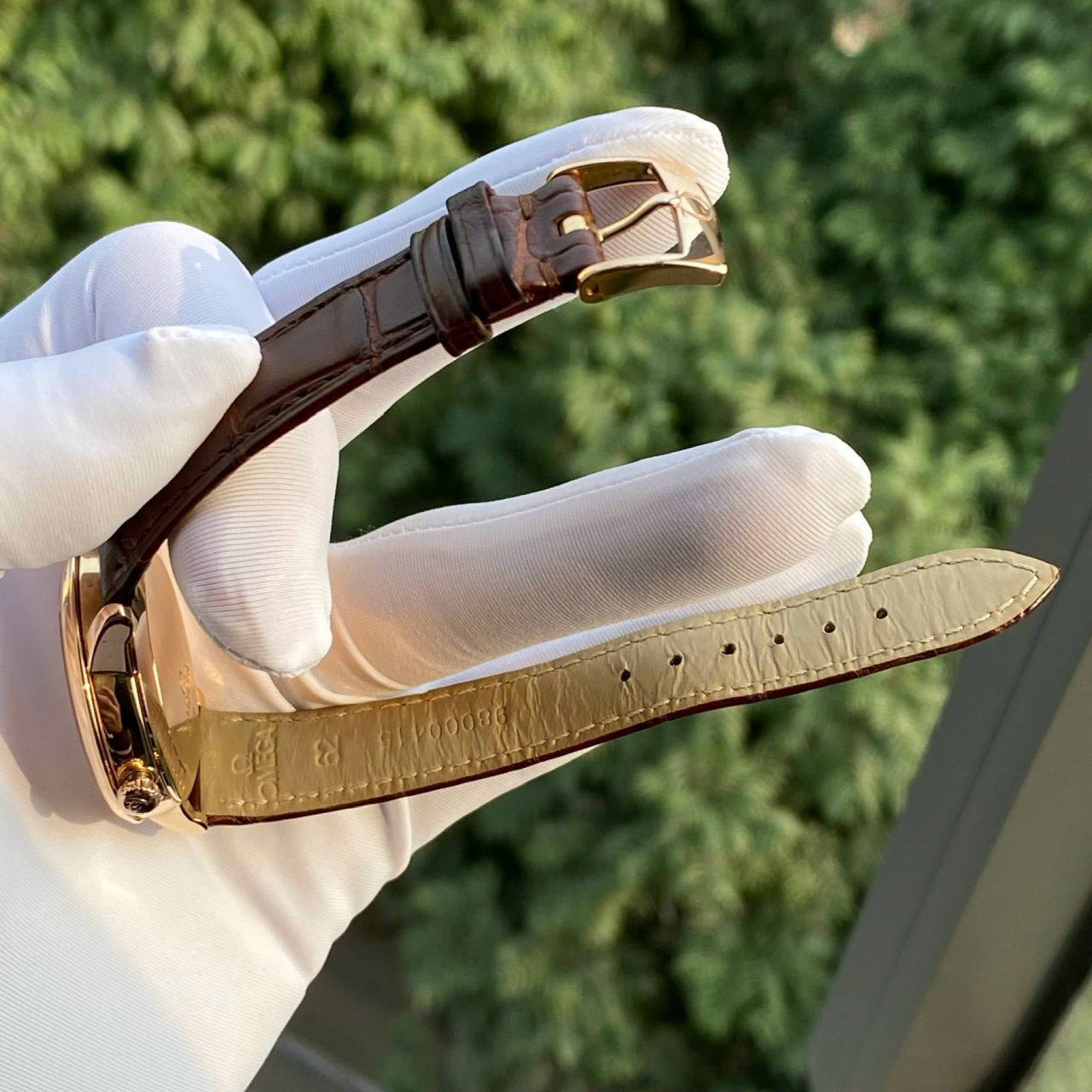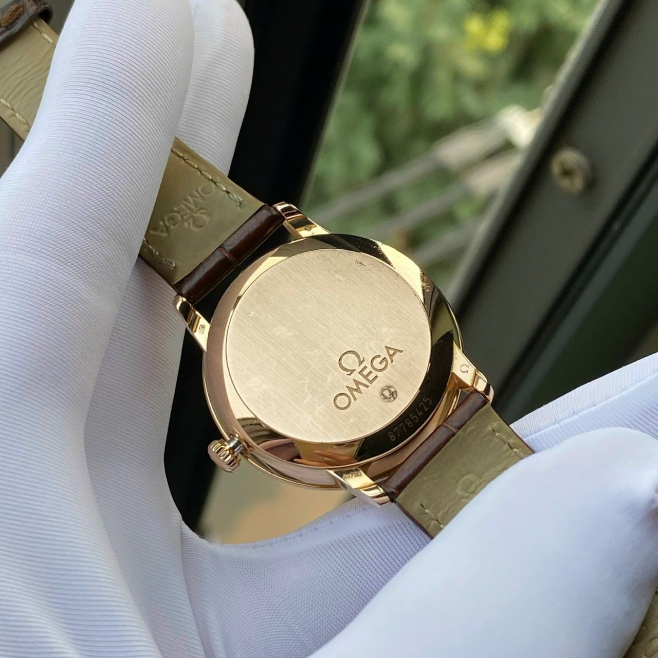 * Núm chỉnh giờ: Làm bằng vàng hồng và khắc nổi logo của Omega