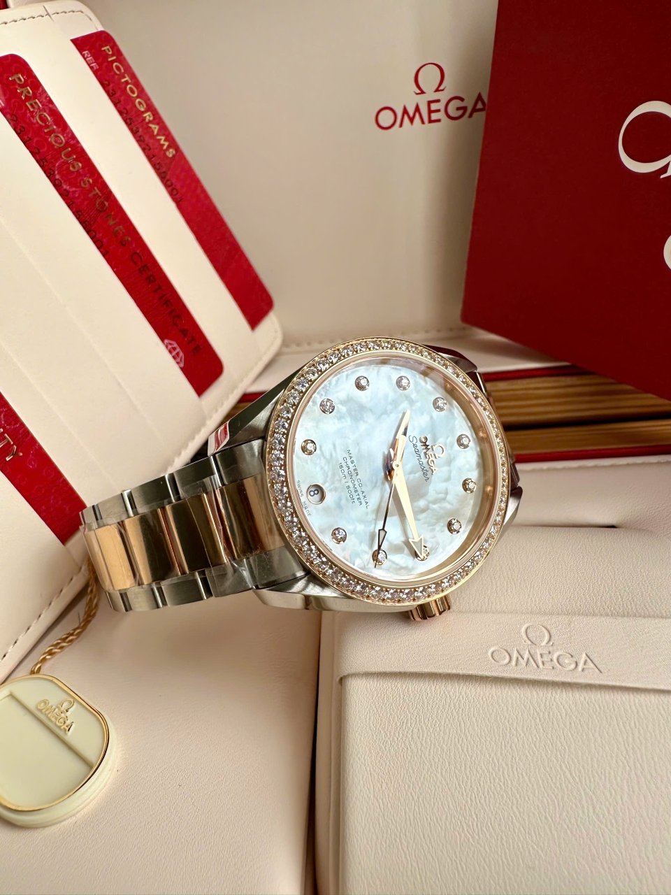 Vỏ 38,5 mm bằng thép không gỉ và vàng đỏ 18K, mặt số trắng xà cừ (mother-of-pearl) với 11 cọc số đính kim cương, viền (bezel) đính kim cương, dây đeo demi (thép + vàng đỏ) tạo cảm giác tinh tế vừa đủ giữa dress watch và sporty.