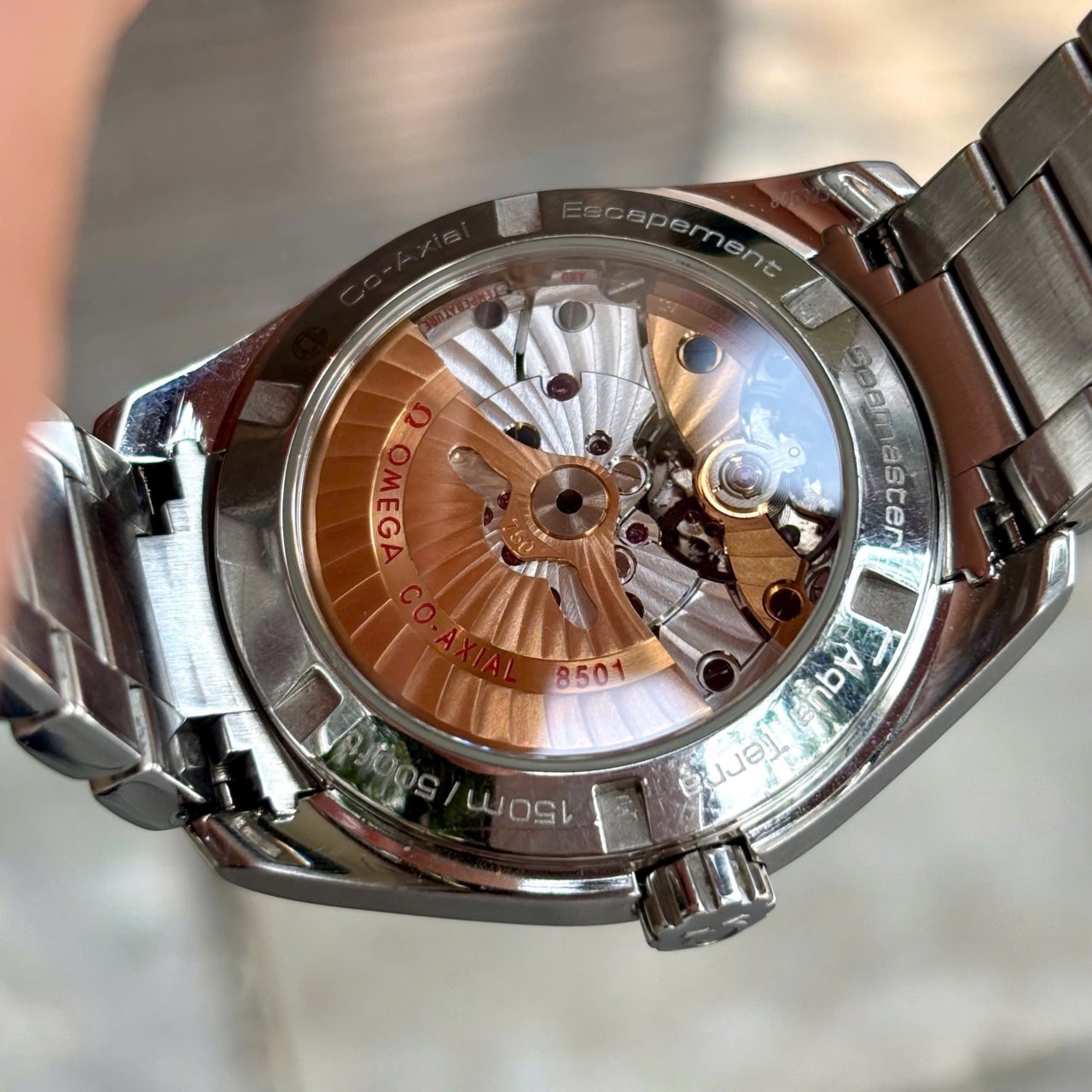 - Chủ cũ đã thay bộ máy 8500 thông thường thành bộ máy Omega 8501 với Co-axial Escapement, chống từ, twin barrel, 60h tích cót, 25200 vph & 39 chân kính với quả văng và cầu máy bằng vàng thật 18k