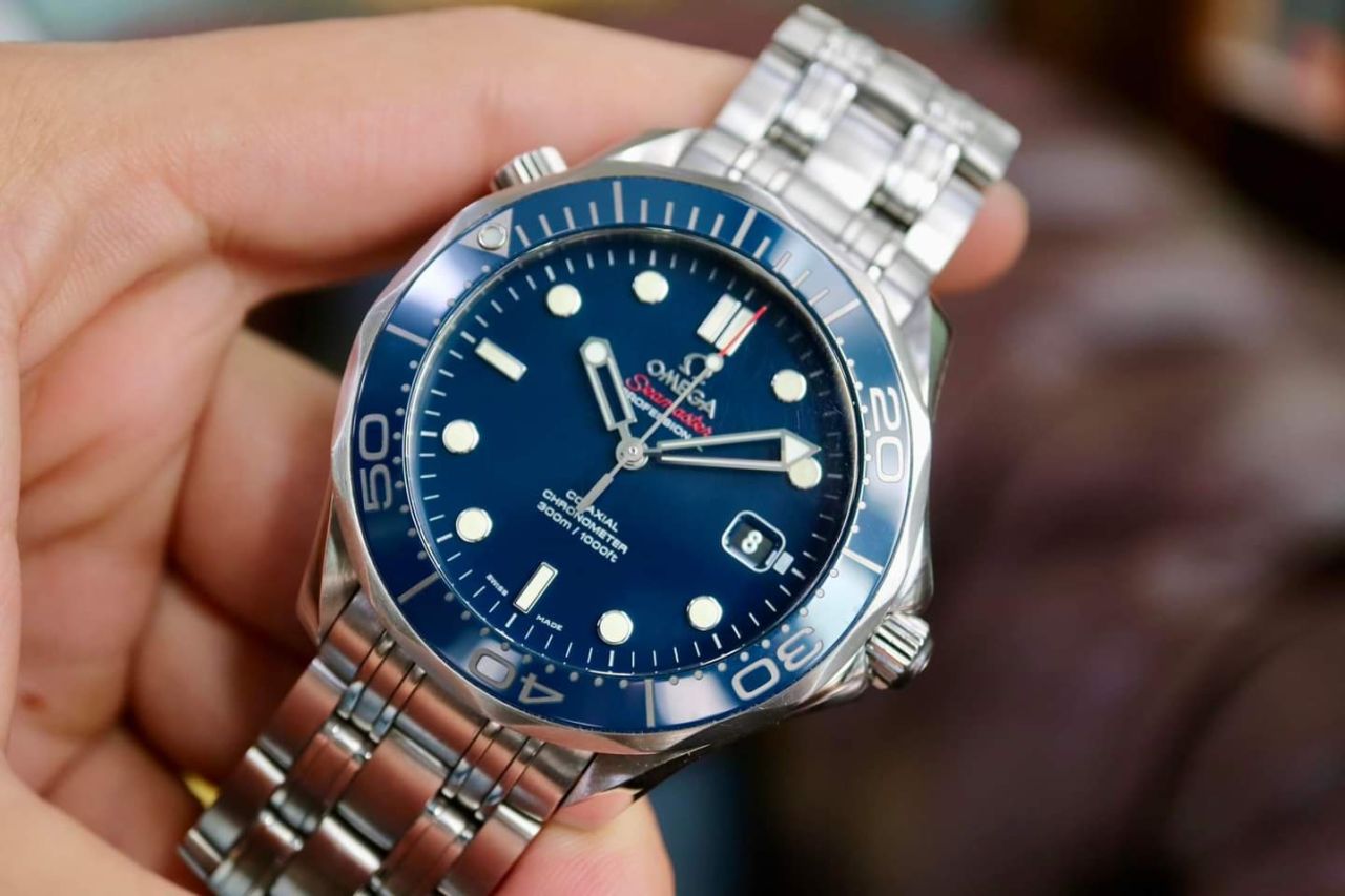 - Mặt số: Mặt tròn màu xanh, kim và số dạ quang. Vòng bezel xoay, có van thoát Helium.