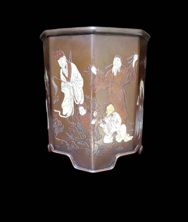 Ống bút bằng đồng chạm khắc và cẩn nhị khí, tích bát tiên rất đẹp.
