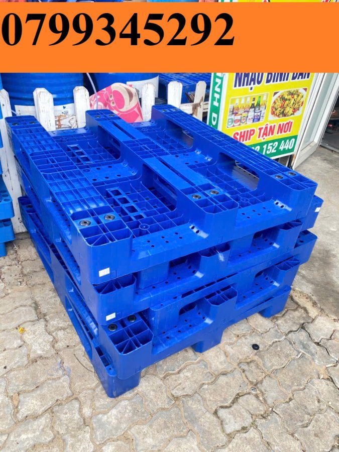 Pallet nhựa 9 chân, nhựa cứng chắc, dễ dàng kê hàng, tiết kiệm diện tích kho. Hàng mới 90–95%, giá rẻ tận gốc.