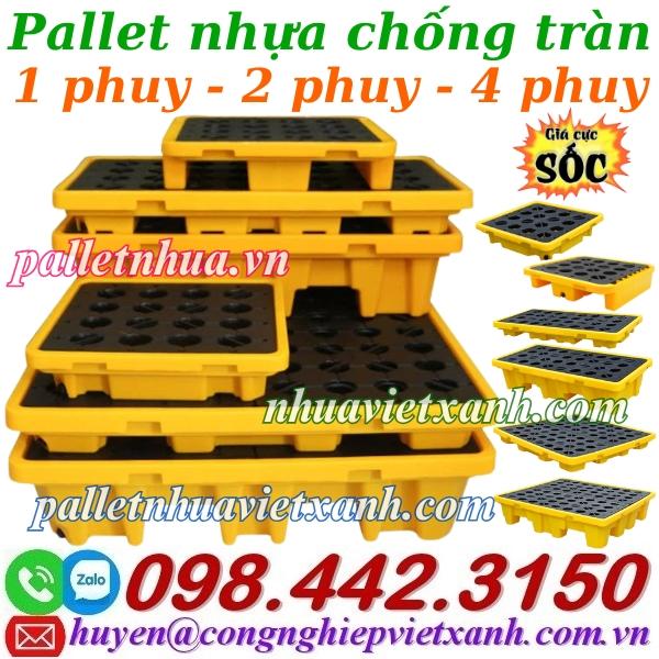 - Pallet nhựa chống tràn là sản phẩm kiểm soát tràn chất lượng cao, bảo vệ cho người lao động và môi trường. Pallet có thể chứa chất lỏng tràn từ 42 lít đến 270 lít tùy theo kích thước khác nhau, giúp lưu trữ và chuyển các thùng dầu, thùng hóa chất dễ dàng và tiết kiệm không gian.