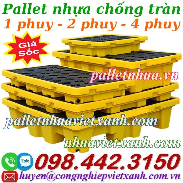 - Pallet nhựa chống tràn là sản phẩm kiểm soát tràn chất lượng cao, bảo vệ cho người lao động và môi trường. Pallet có thể chứa chất lỏng tràn từ 42 lít đến 270 lít tùy theo kích thước khác nhau, giúp lưu trữ và chuyển các thùng dầu, thùng hóa chất dễ dàng và tiết kiệm không gian.
