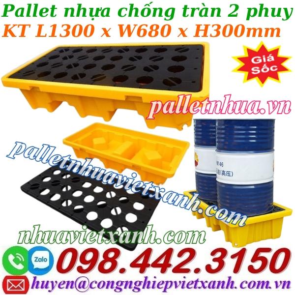 - Pallet nhựa chống tràn 2 phuy - khay nhựa chống tràn 2 phuy kích thước 1300x680x300mm đáp ứng các quy định về ngăn tràn cho tối đa 2 thùng phuy và tuân thủ các yêu cầu về ngăn tràn của SPCC và EPA.