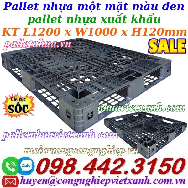 - Pallet nhựa màu đen 1200x1000x120mm là loại pallet liền khối, được sản xuất từ nhựa tái sinh và được phủ chất chống tia UV có thể chịu được nhiệt độ cao ngoài trời.