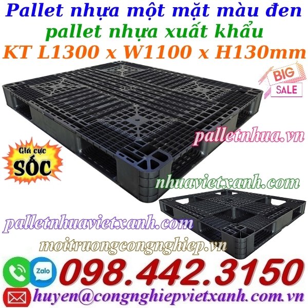 - Pallet nhựa màu đen 1300x1100x130mm là loại pallet liền khối, được sản xuất từ nhựa tái sinh và được phủ chất chống tia UV có thể chịu được nhiệt độ cao ngoài trời.