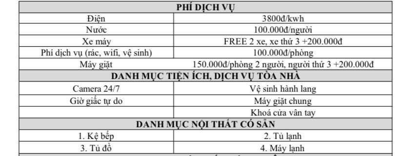 +Tiền dịch vụ: điện 3.800d/kwh, nước 100k/ người, xe máy : ff 2 xe , rác , wifi , vệ sinh : 100k/phòng , máy giặt : 150k/phòng ( người thứ 3 : 200k)