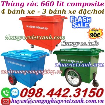 Thùng rác 660 lít nhựa composite 4 bánh xe và 3 bánh xe đặc/hơi