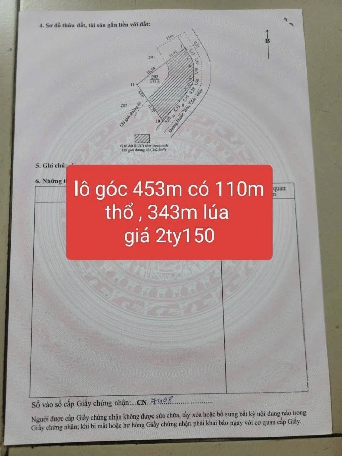 Bán đất đường Phước Toàn , Long Hiệp dt 453m2 ( 110m2 thổ + 343m2 đất lúa) giá 2,15 tỷ