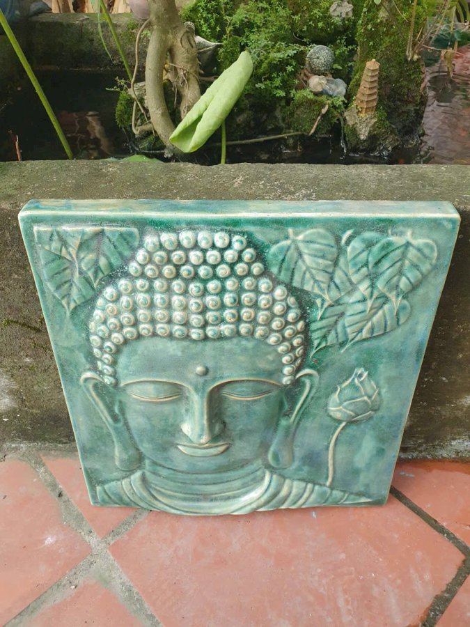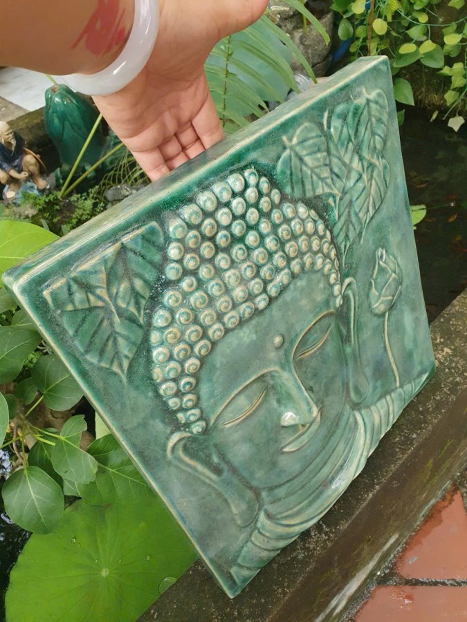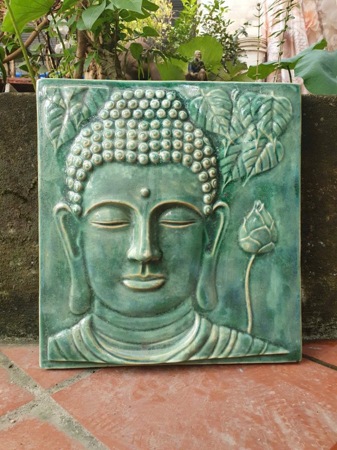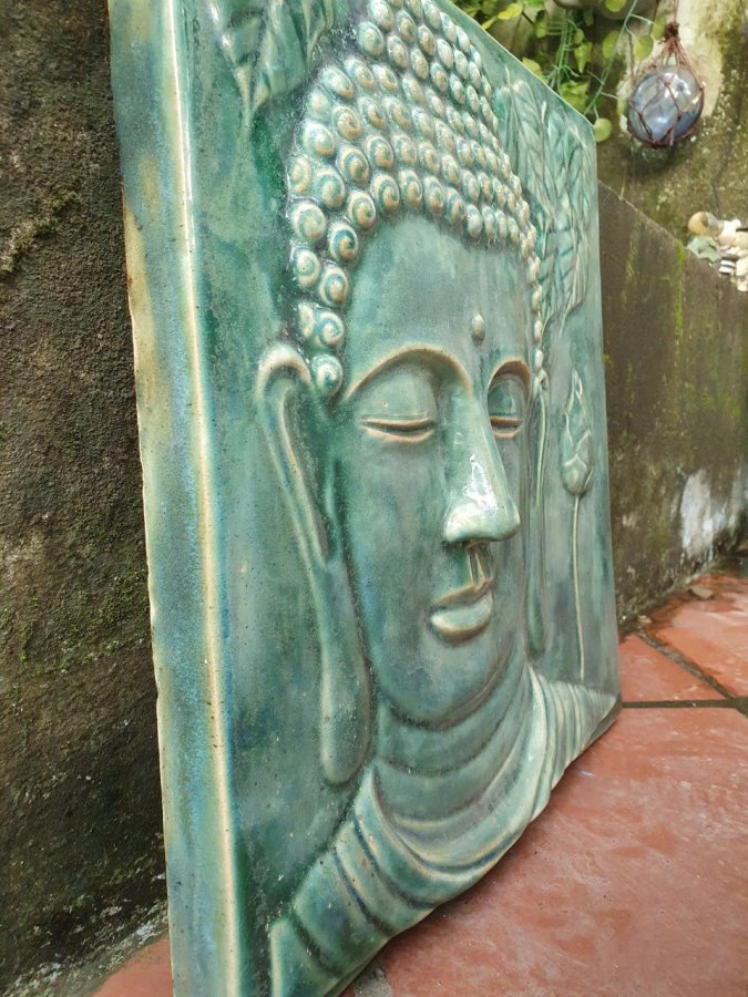 Phù điêu tranh Phật Đầu.KT 36cm*39cm*4,5cm,men xanh đồng trổ bông đặc trưng gốm Biên Hòa