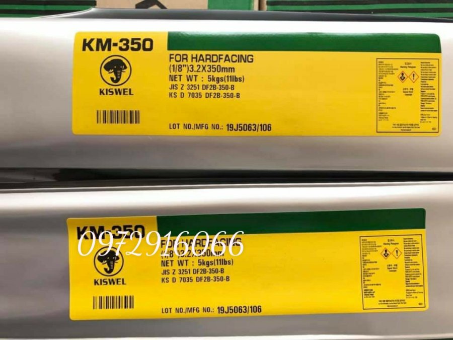 - KM-350 là que hàn chống mài mòn độ cứng mối hàn đạt 350 HV, chuyên dùng hàn đắp cứng, phủ cứng con lăm, bàn nghiền, cánh vít chịu tải máy trộn. Que hàn chịu mài mòn Kiswel KM-350 sau khi hàn xong có thể gia công được