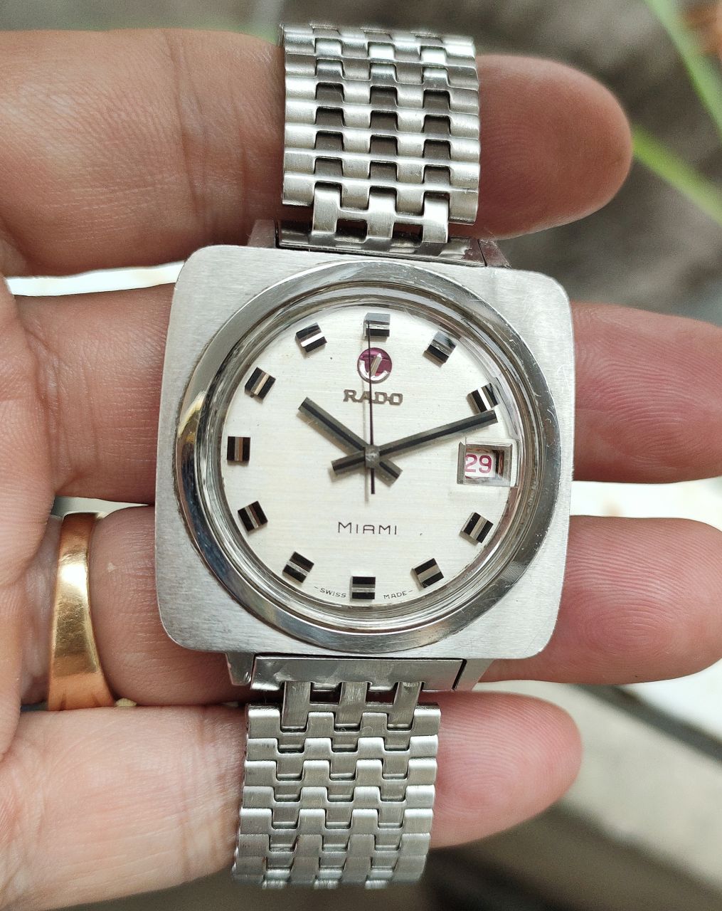 Rado Miami Automatic 25 Jewels, hàng sưu tầm, mới đẹp zin nguyên toàn bộ, fom bánh chưng đẹp lạ, zin chỗ nào cũng có logo với 6 mỏ neo luôn. Size men khoảng 38 tròn