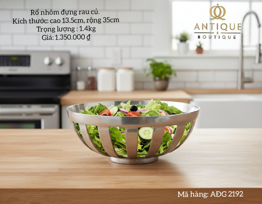 Rổ nhôm đựng rau củ. Kích thước: cao 13.5cm, rộng 35cm. Trọng lượng : 1.4kg. Giá: 1.350.000 ₫. Mã hàng: AÐG 2192