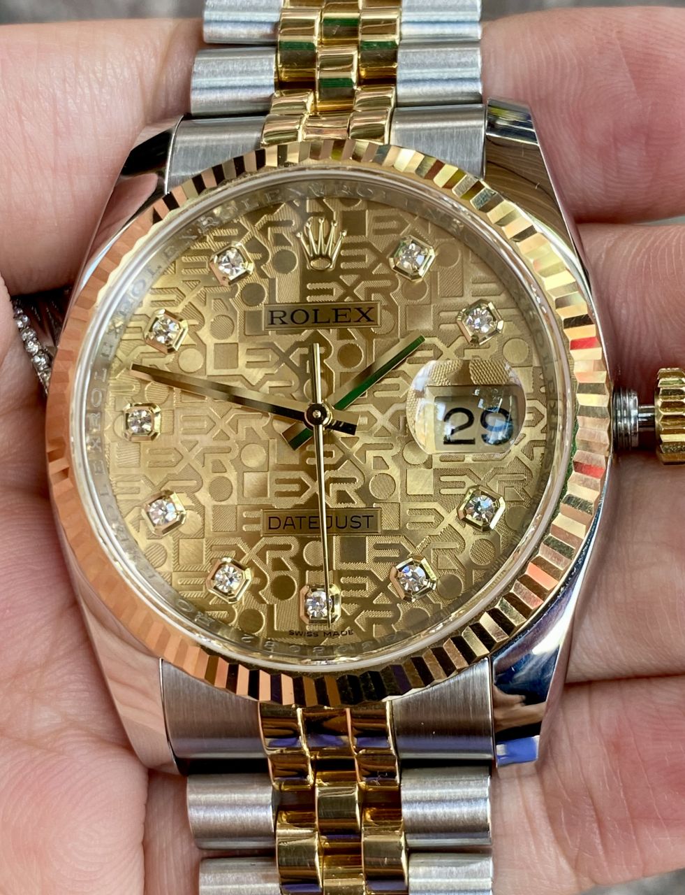 ⛔Rolex 116233 6số Datejust Champagne Computer Diamond Dial Jubilee, Seri G date cao dây tóc xanh, caliber 3135 31jewels 5 position chronometer ( COSC ) chính hãng RL thuỵ sĩ sản xuất. Thân vỏ demi ss thép 904L / 18k Gold, niềng khía zin Vàng Đúc 18k bén cạnh.
