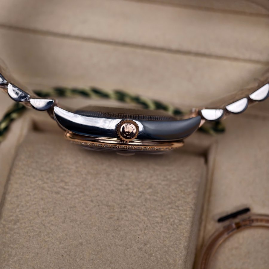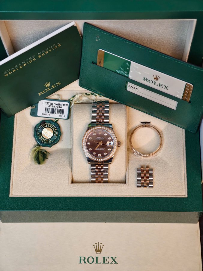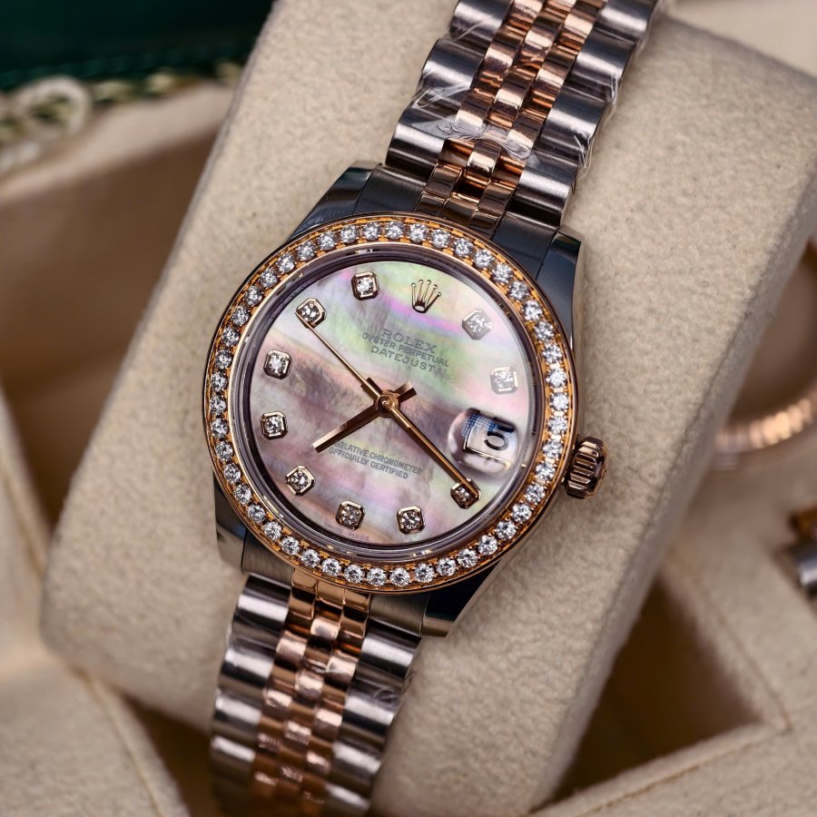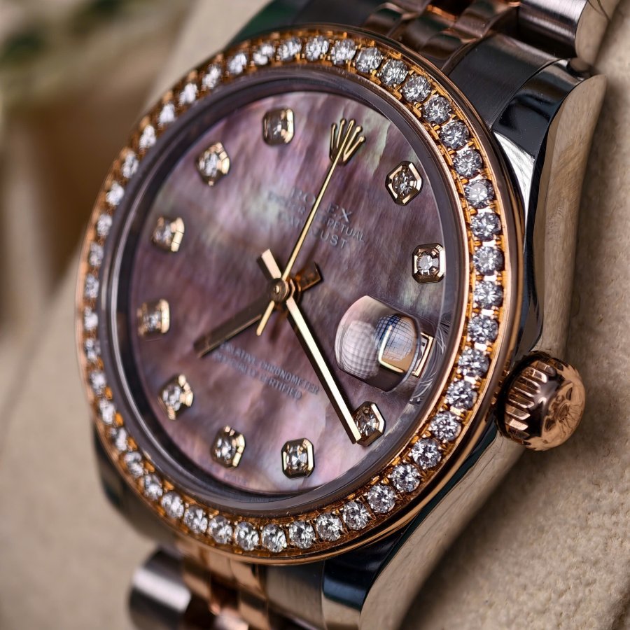 Rolex lady-datejust 178271 Tình trạng full box sổ thẻ Size 31mm Calibre 2235 automatic Dây vỏ demi 18k vàng hồng Mặt số xà cừ tím rất hiếm Cọc số đính kim cương 2 niềng niềng kim cương độ Niềng khía zin