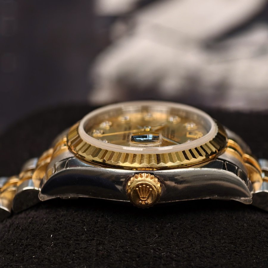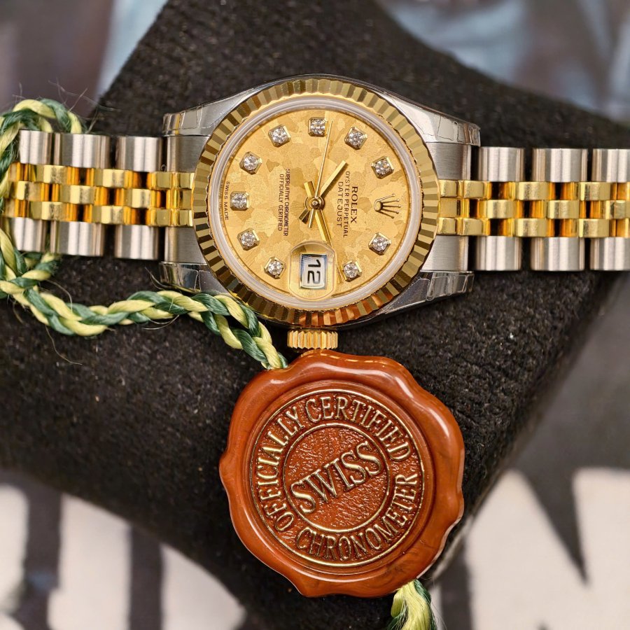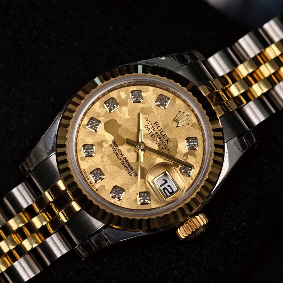 Rolex lady-datejust 179173Tình trạng chưa sử dụng thất lạc sổ thẻSize 26mmCalibre 2235 automatic Dây vỏ demi 18k Gold Mặt số thiên thạch vàng rất hiếmCọc số đính kim cương