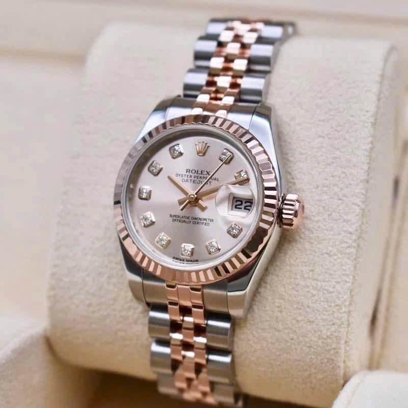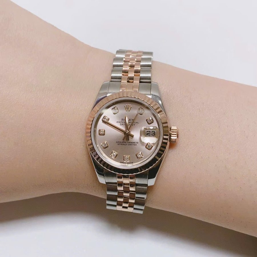 Rolex nữ demi vàng hồng 18K model 179171 . Mặt vàng hồng cọc số kim cương. Đầy đủ hộp sổ thẻ và bill mua lúc đầu.