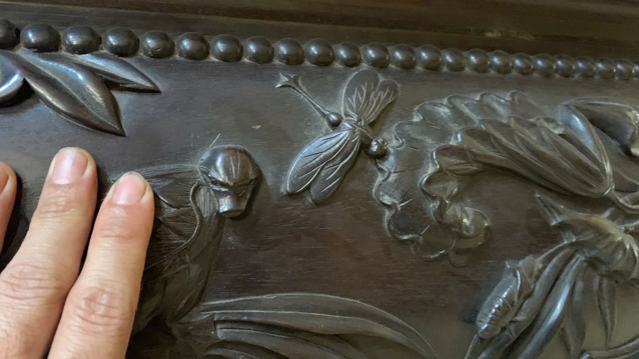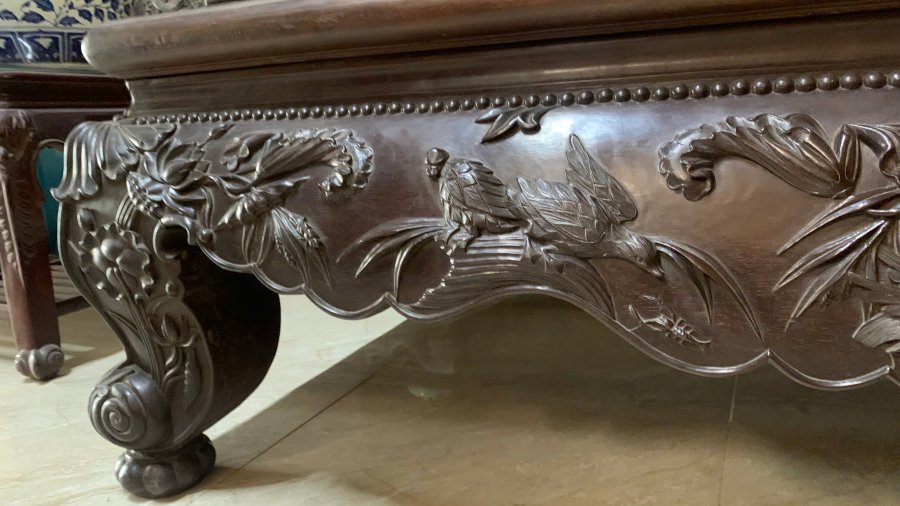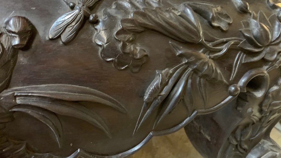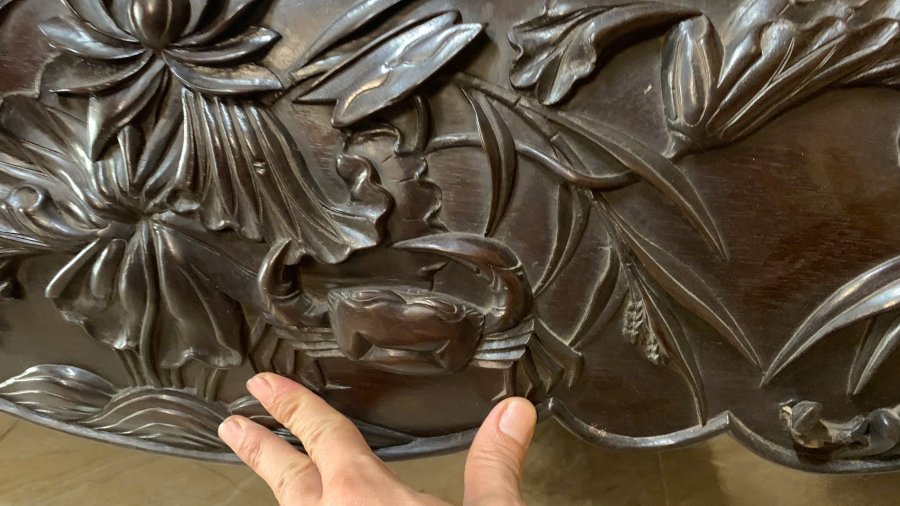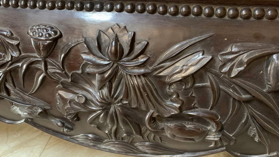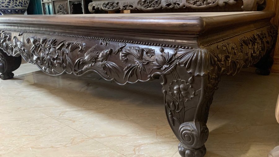 Sập sen vịt gỗ gụ cổ liền mặt 2 lá đục chạm tay sắc nét