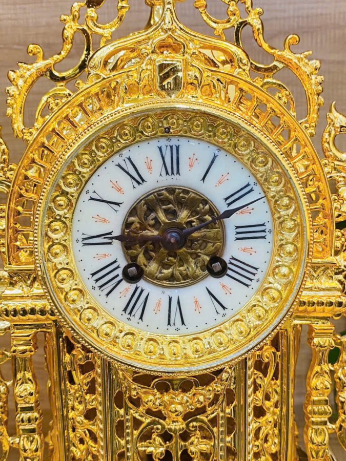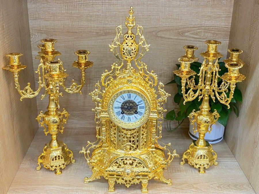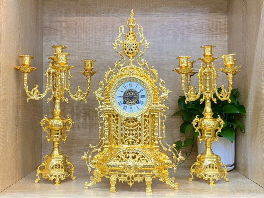 Set bộ đồng hồ và chân nến đồng lắc kê vàng Pháp xưa