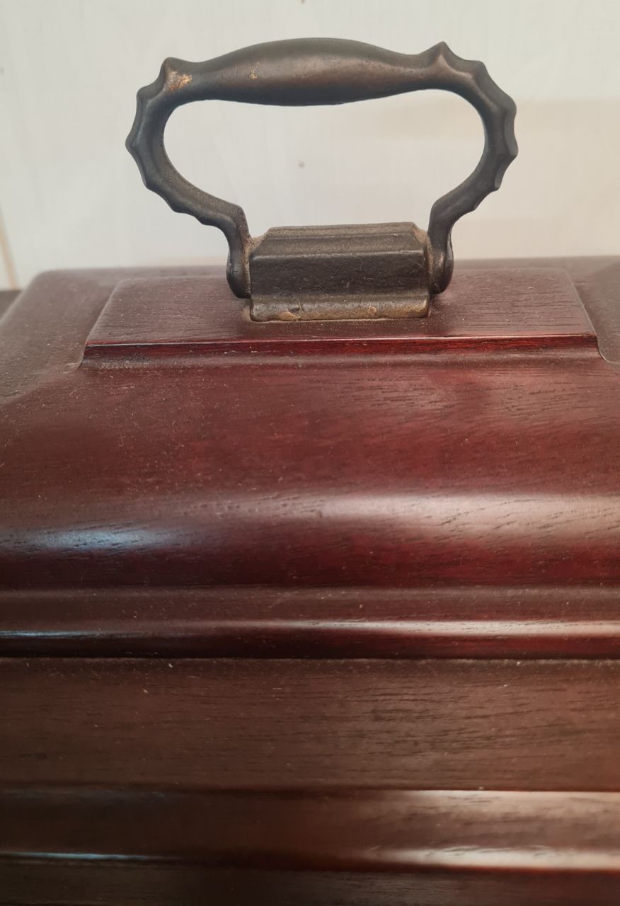 👉Vỏ gỗ tự nhiên nguyên khối còn rất đẹp, chi tiết bằng đồng.