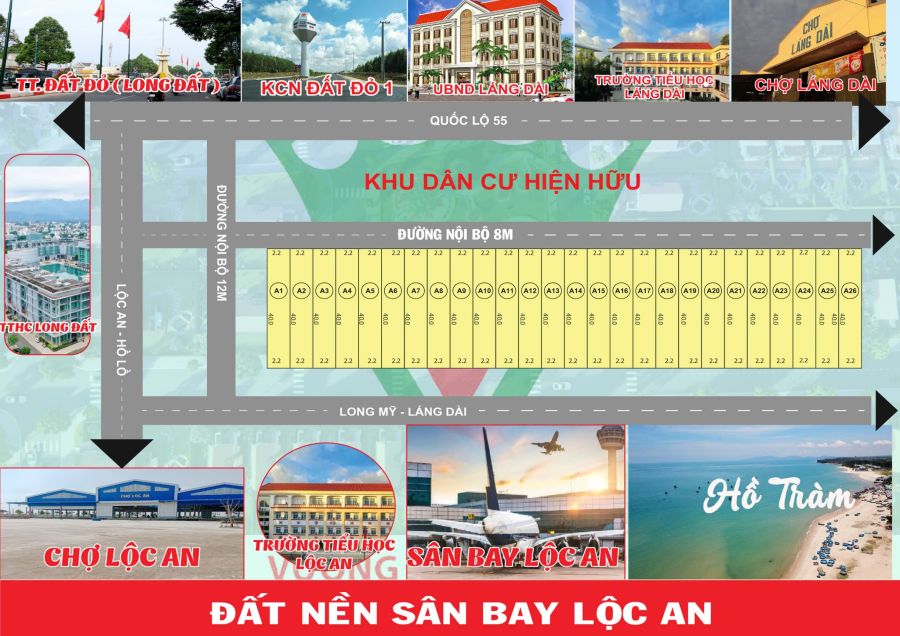 📍 Vị trí cực đẹp: Nằm ngay mặt tiền đường 8m, sát sân bay Lộc An – trung tâm phát triển du lịch và logistic mới của Bà Rịa - Vũng Tàu.