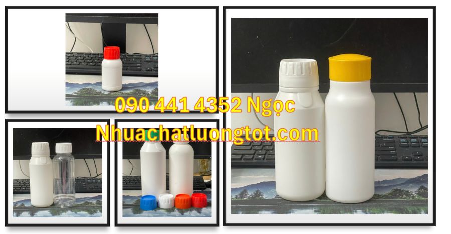 Chai nhựa 1 lít đựng vi sinh, vỏ chai nhựa 500ml đựng hóa chất, chai lọ 250ml đựng cồn, chai nhựa 100ml đựng dung môi, lọ đựng hóa chất 50ml