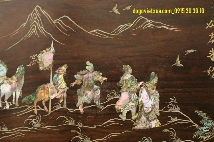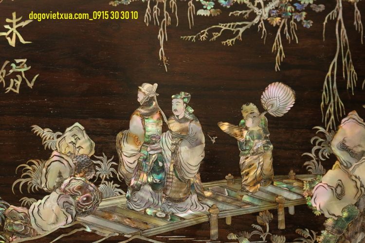 Bức Tranh Cổ Gỗ Trắc này được nghệ nhân gốc Huế khảm ốc nghệ thuật truyền thần là 1 trong những bức tranh khảm kỹ thuật nhất mà em hữu duyên sưu tầm được. Là phong cách khảm ốc kiểu truyền thần, chi tiết cắt trất nhiều & sâu nét để lấy thần thái của nhân vật. Thường thì chỉ có những quý vật nhỏ như khay trà , quả trầu hay những chiếc đĩa người nghệ nhân mới đầu tư công sức để khảm theo phong cách này. Vì nối cắt tnày rất ít nghệ nhân làm được, và làm công phu hơn nhiều lần so với nối cắt tthông thường. Các nhân vật được khảm truyền thần rất có hồn, các chi tiết tđậm nét làm nổi phong thái của nhân vật .