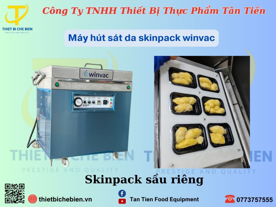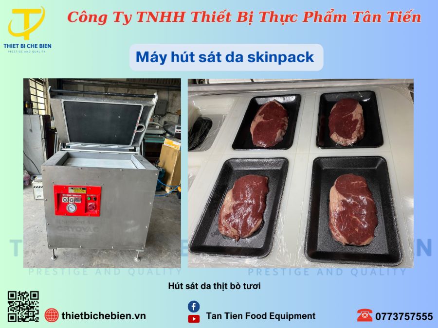 Máy hút chân không sát da skinpack được sử dụng rộng rãi trong các cơ sở công ty chế biến thực phẩm , công dụng của máy là đảm bảo thực phẩm ở giữa màng chân không trong suốt và khay hoặc đĩa, sản phẩm được đặt ở trong môi trường chân không.