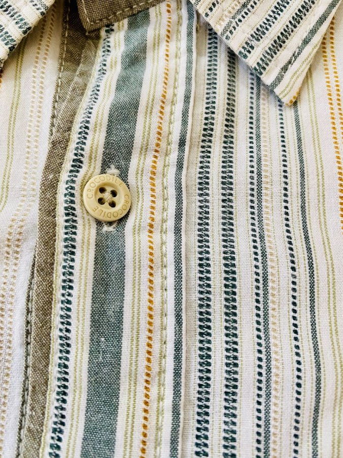 Chi tiết: Cổ áo phối lót Kaki tinh tế, cúc dập chìm hiệu, logo thêu túi ngực sắc nét.