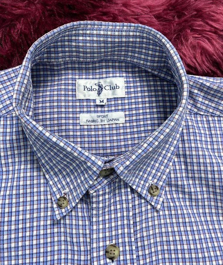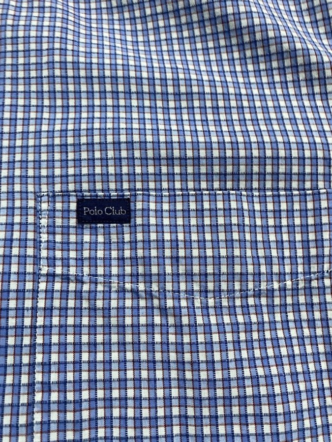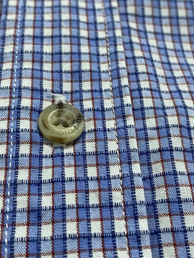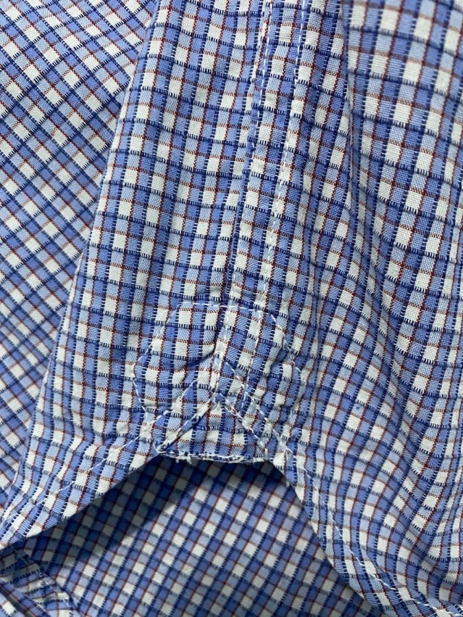 - sơ mi kẻ ca-rô với sự pha trộn của màu xanh dương, trắng và các đường kẻ đỏ tía.
