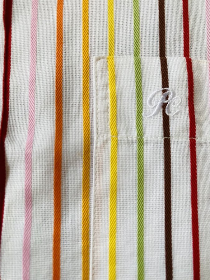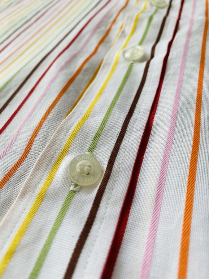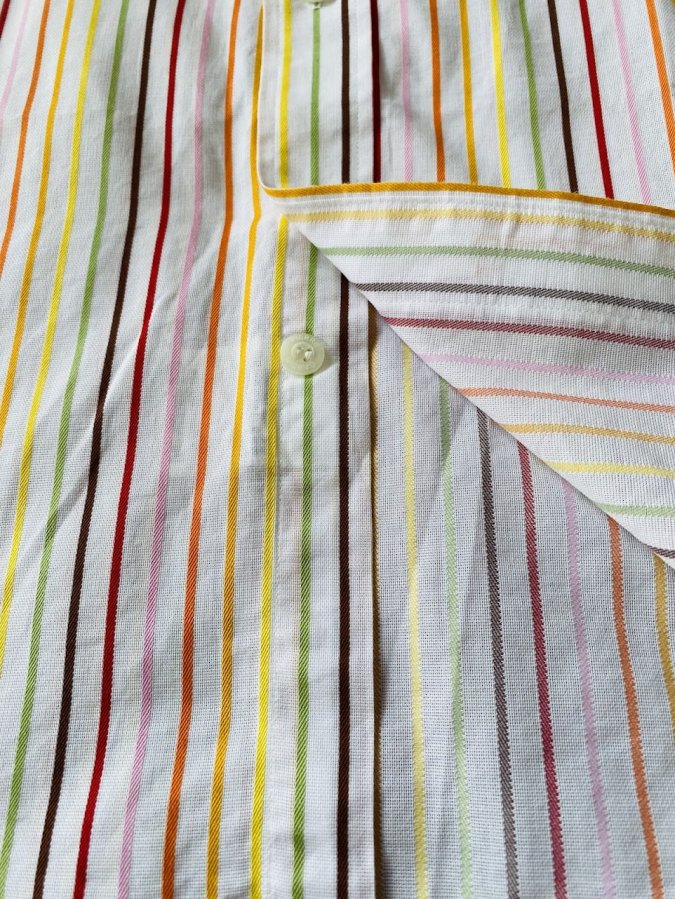 - Họa tiết: Sọc đa sắc bao gồm các tông màu: đỏ, cam, vàng, xanh lá, nâu và hồng trên nền trắng. Cách phối màu này mang phong cách cổ điển nhưng vẫn trẻ trung, năng động.