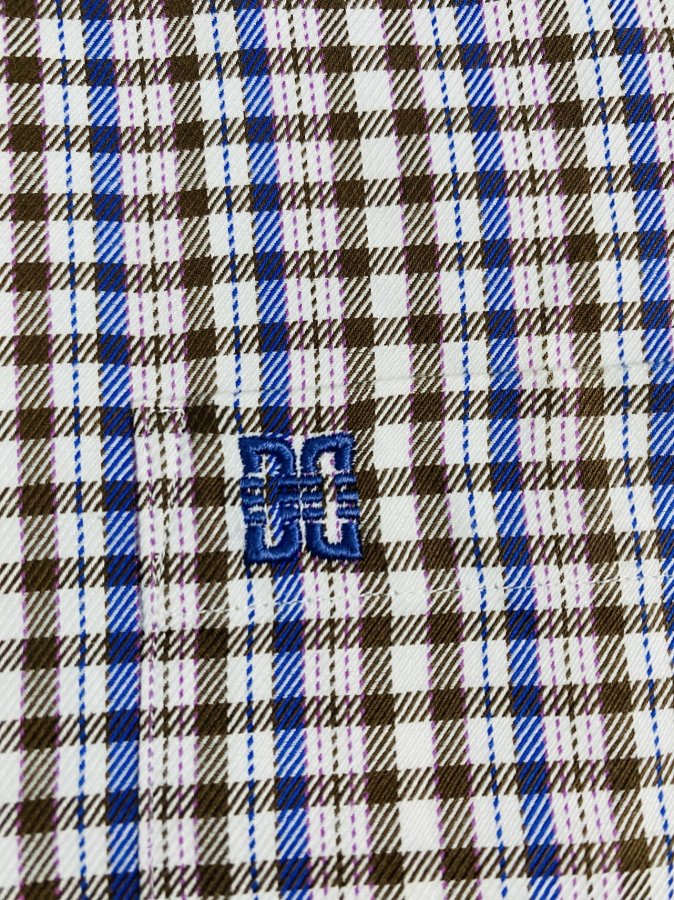 - Logo: Trên nắp túi ngực có thêu nổi logo chữ "DD" lồng vào nhau bằng chỉ màu xanh dương, trùng với màu của đường kẻ sọc trên áo
