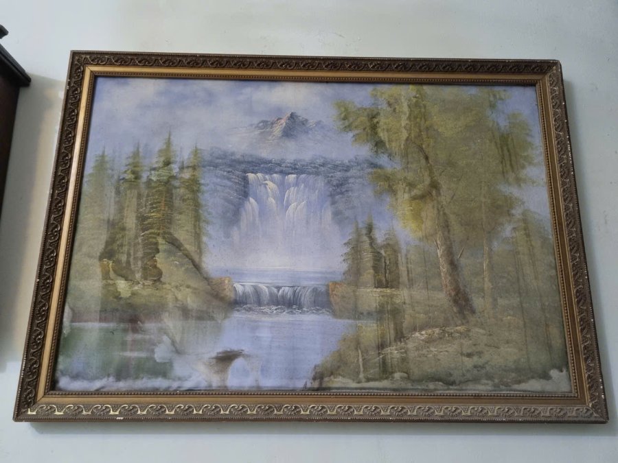 Tranh màu nước, vẽ trên vải. Khung đẹp. Tranh cũ, một số chỗ có vết ố như hình.