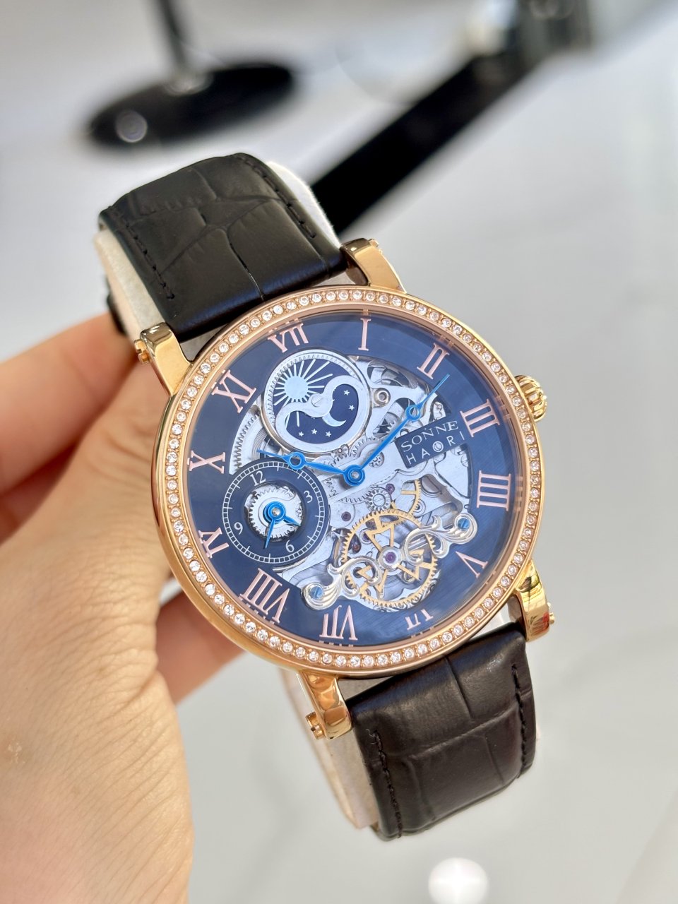 SONNE HAORI hàng trưng bày chưa qua sử dụng - Vàng hồng niềng đính đá - Thương hiệu cao cấp nội địa Nhật - Máy cơ Tự động, dòng này máy chạy chuẩn và ổn định - size 43 lịch trăng sao lộ 2 mặt ✨3,8 triệu
