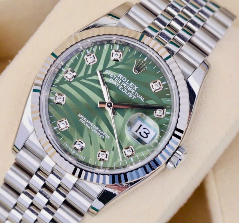 Rolex Datejust 126234 Diamonds Lá Cọ Xanh, Niềng vàng trắng đúc 18k nguyên khối, Size 36mm
