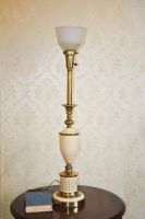 Cặp đèn xưa cổ điển được làm bằng đồng với kiểu dáng cao, chóa được làm bằng thủy tinh .