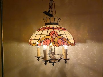Đèn tiffany chuẩn xưa nhập từ Mỹ. có 5 nhánh khung bằng đồng.